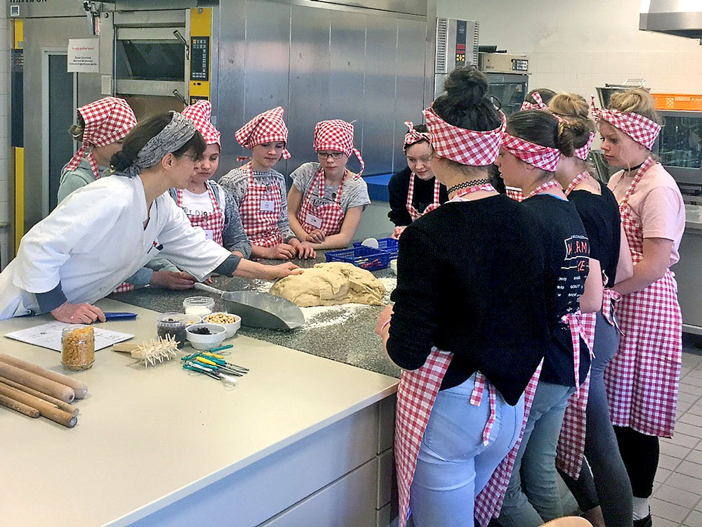 Zwölf wissbegierige Schülerinnen im Alter von 10 bis 13 Jahren konnten in unserer Konditorei und im Genlabor in verschiedene Berufsbereiche hineinschnuppern und praktische Erfahrungen sammeln. In der Konditorei wurde unter fachkundiger Anleitung Hefeteig angesetzt und daraus tolle Kunstwerke gebacken, die am Ende des Tages nicht nur bestaunt, sondern auch als leckeres Erfolgserlebnis mit nach Hause genommen wurden.