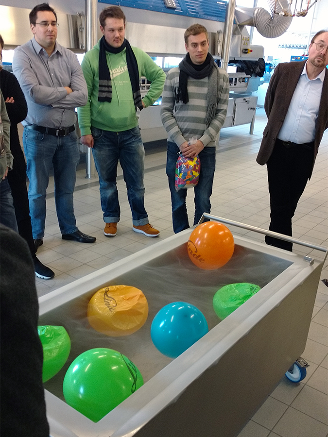 Der Donnerstag stand im Zeichen des Einsatzes von Gasen in der Lebensmittelindustrie. Das Unternehmen Linde AG führte ein Seminar mit abschließendem Test durch. Alle Studierenden bestanden mit „gut“ und „sehr gut“ und erhielten ein Zertifikat. Anschließend bekamen die Studierenden im Technikum des Hauses ungewöhnliche Einblicke zum Thema Gase im Allgemeinen und zu modernsten Anwendungen.