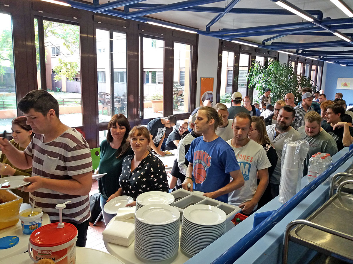 Auch an diesem Tag musste sich niemand um sein leibliches Wohlergehen sorgen, denn an der Emil-Fischer-Schule verhungert natürlich keiner; kulinarische Highlights wie Rollbraten, Leberkäse mit Kartoffel- und Krautsalat und Schrippen sowie Hopfensmoothies wurden von den angehenden Techniker/-innen gezaubert und anschließend auch verzehrt. Die Linzer Torte lieferte ein vorzügliches Finale.