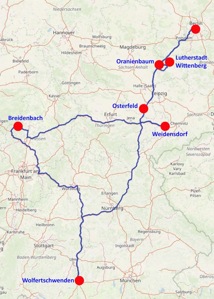 Vom 8. bis 14. September 2019: Berlin – Wolfertschwenden – Breidenbach – Weidensdorf – Osterfeld – Lutherstadt Wittenberg – Oranienbaum – Berlin