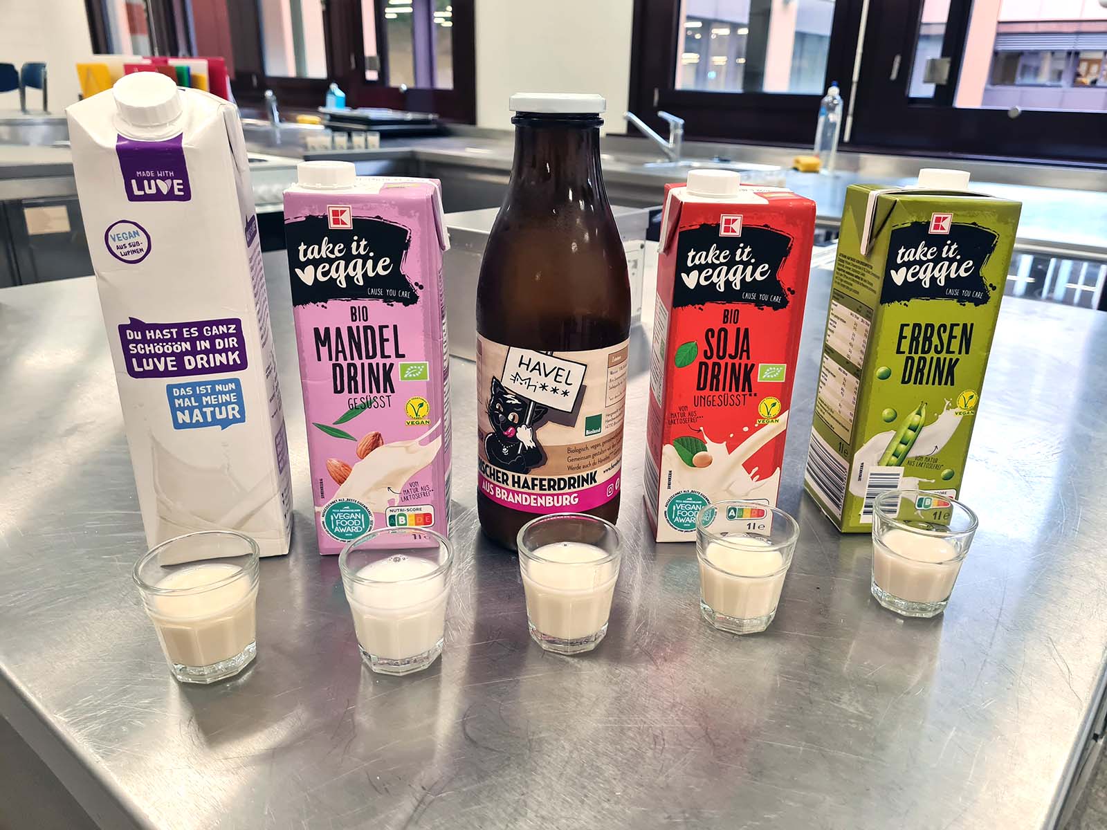 Neben bereits bekannten Produkten, wie Soja-, Mandel- und Haferdrink, wurden auch die eher unbekannteren Milchalternativen Lupinen- und Erbsendrink verkostet.