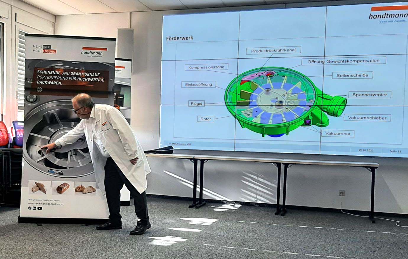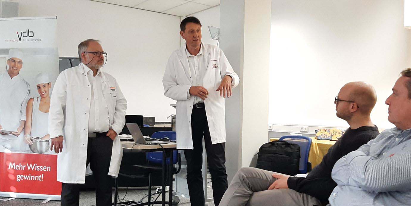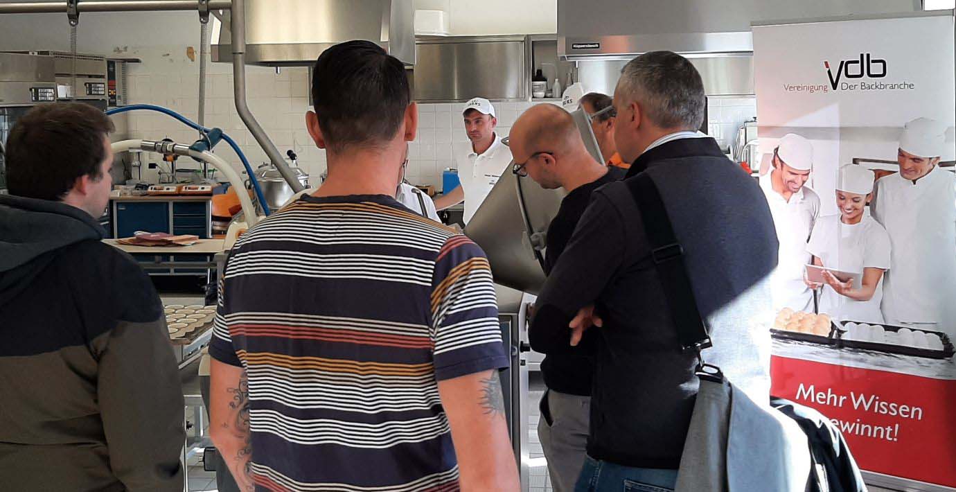 Bernhard Vetter von der Firma Handtmann gelang es eindrucksvoll, dieses Versprechen zu verdeutlichen. In den Räumen der Berliner Emil-Fischer-Schule (Staatliche Fachschule für Lebensmitteltechnik) präsentierte er zusammen mit der Firma IREKS die Funktionsweise des Teigteilers seines Unternehmens. Im Rahmen einer 45-minütigen praktischen Demonstration mit anschließendem Vortrag und Diskussion konnte gezeigt werden, dass es möglich ist, vier vollkommen verschiedene Produkte nacheinander ohne zeitaufwändige Umrüstungen gewichtsgenau und produktschonend zu portionieren.
