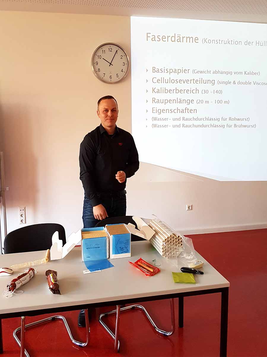 Am 02.04.2019 kam André Bischoff (ViskoTeepak Deutschland, Anwendung und Verkauf) an die Fachschule und begleitete die Studierenden durch das Programm. Gekennzeichnet durch qualifizierte Nachfragen und die Fachkompetenz der Firma ViskoTeepak war es ein sehr interessantes und umfangreiches Seminar. Schwerpunkt des Seminars waren Kunstdärme aus natürlichen und künstlichen Rohstoffen.