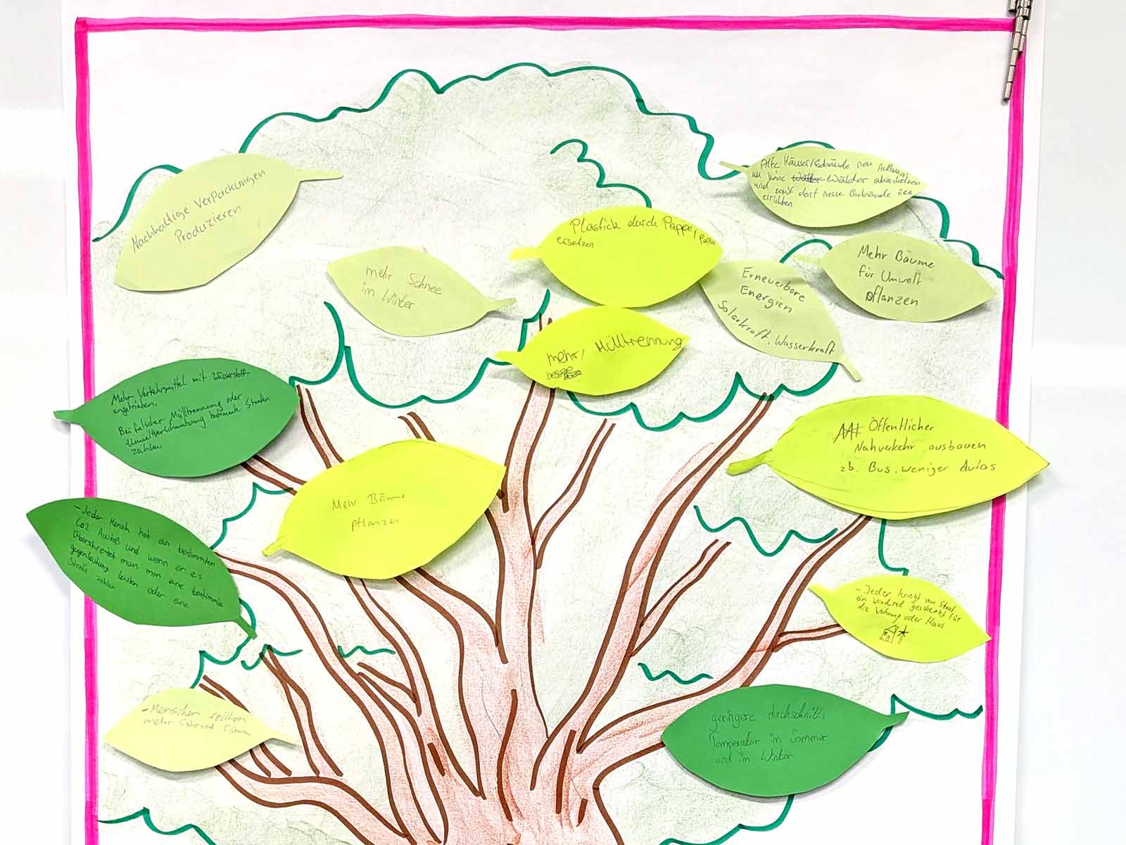 In einem der Workshops wurde ein Utopie-Baum als Visualisierungsmöglichkeit der Einflussmöglichkeiten auf Klimagerechtigkeit verwendet. Diesen durften wir als Schule behalten und werden ihn nutzen, um unsere eigenen utopischen Wünsche hier zu visualisieren.