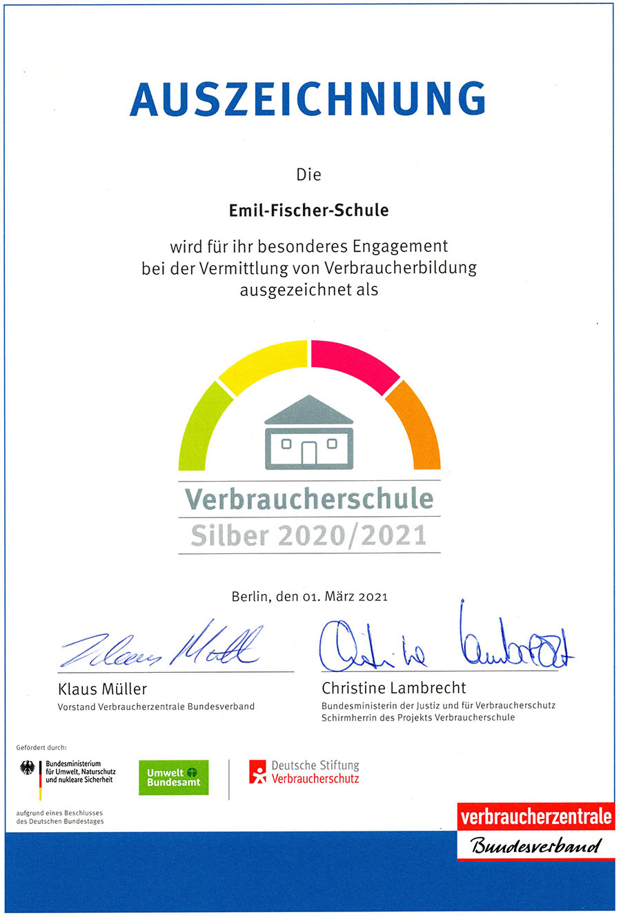 Am 1. März 2021 wurde unsere Schule vom Verbraucherzentrale Bundesverband erneut als Verbraucherschule Silber ausgezeichnet. Gewürdigt wurden das Cafeteriaprojekt, das Schulgartenprojekt und die Unterstützung beim Selbstschutz gegen Corona (Mund-Nasen-Schutz) im vergangenen Schuljahr.