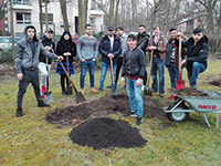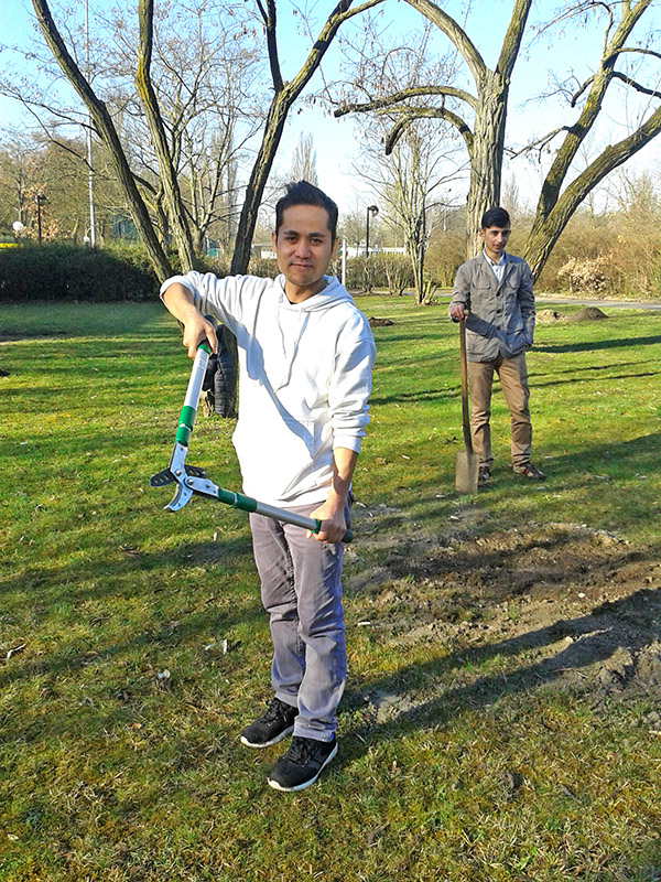 An Tag zwei haben wir die Bäume und Sträucher in die Löcher gepflanzt. Das Wetter war dieses Mal viel besser, die Sonne hat geschienen. Dann haben wir eine Kleinigkeit gefrühstückt.