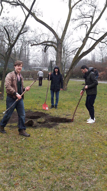 Dann haben wir mit Spaten und Schaufeln circa 15 Löcher gegraben. Das Wetter war nicht so gut und es hat ein bisschen geregnet, deshalb sind wir nass geworden. Wir haben Musik gehört und dazu getanzt.