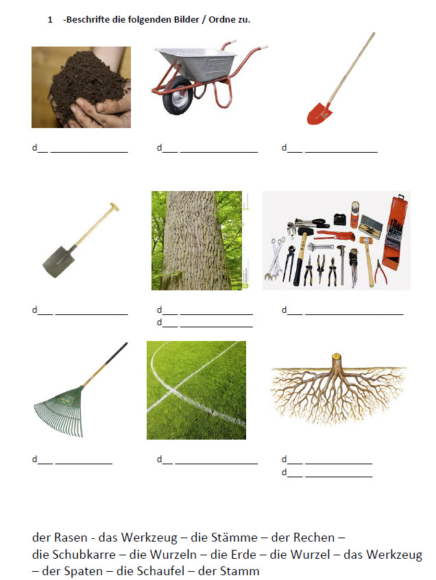 Am ersten Tag haben wir zuerst das Gartenwerkzeug aus der Garage geholt und mit den zwei Schubkarren zum Garten gebracht.