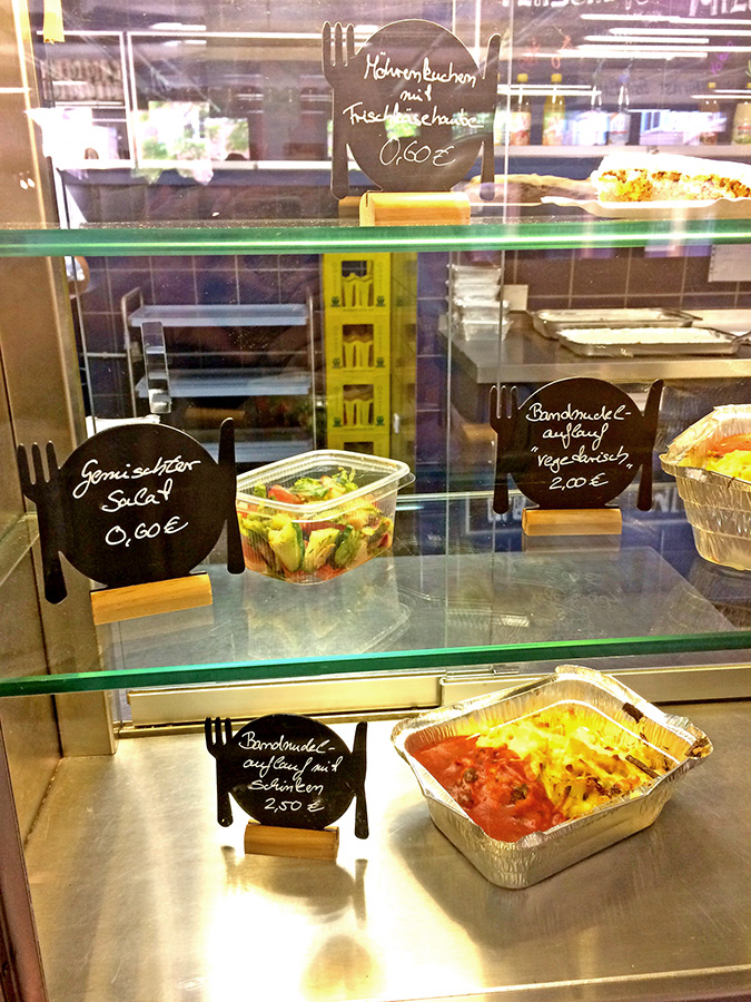 Neben kleinen Snacks und Getränken wird auch „Essen to go“ angeboten. Wer sich noch für einen Salat und eine Nachspeise entscheidet, hat sogar ein „Menü to go“. Und das ist alles selbstgemacht – by EFS (Emil-Fischer-Schüler/-innen).