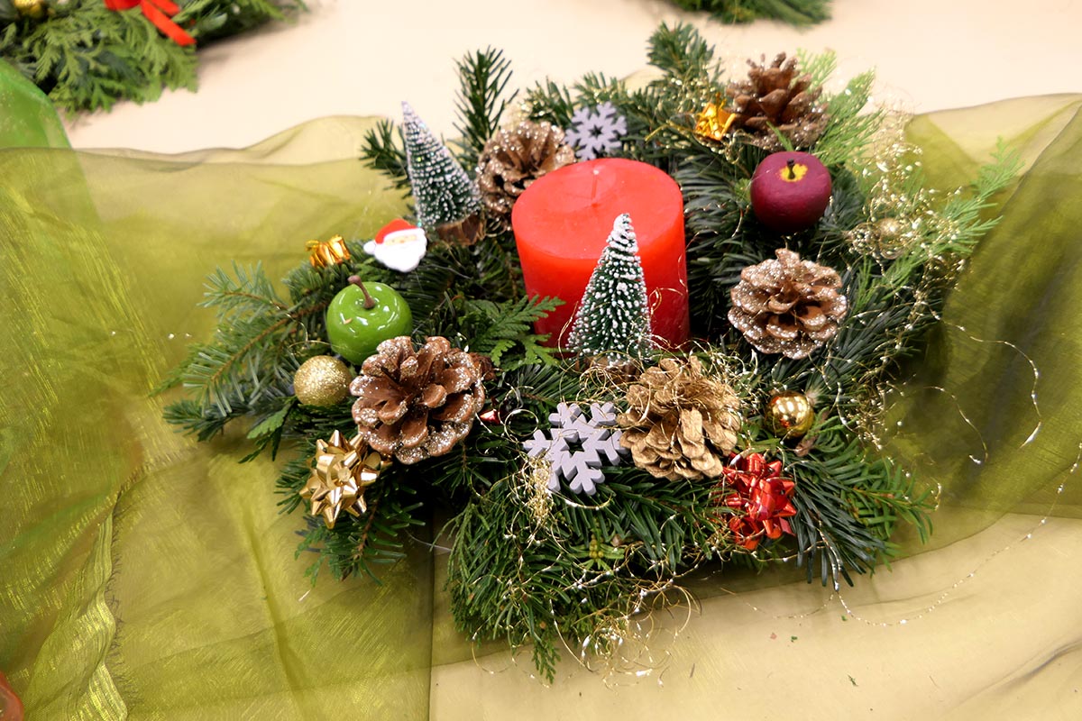 Daraus entstanden zahlreiche wunderschöne Adventskränze und Weihnachtsgestecke, auch Weihnachtsbäume und Auslagen wurden geschmückt.
