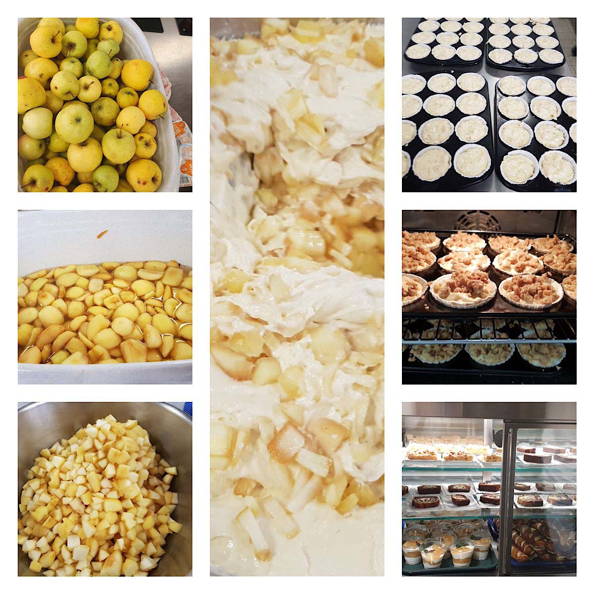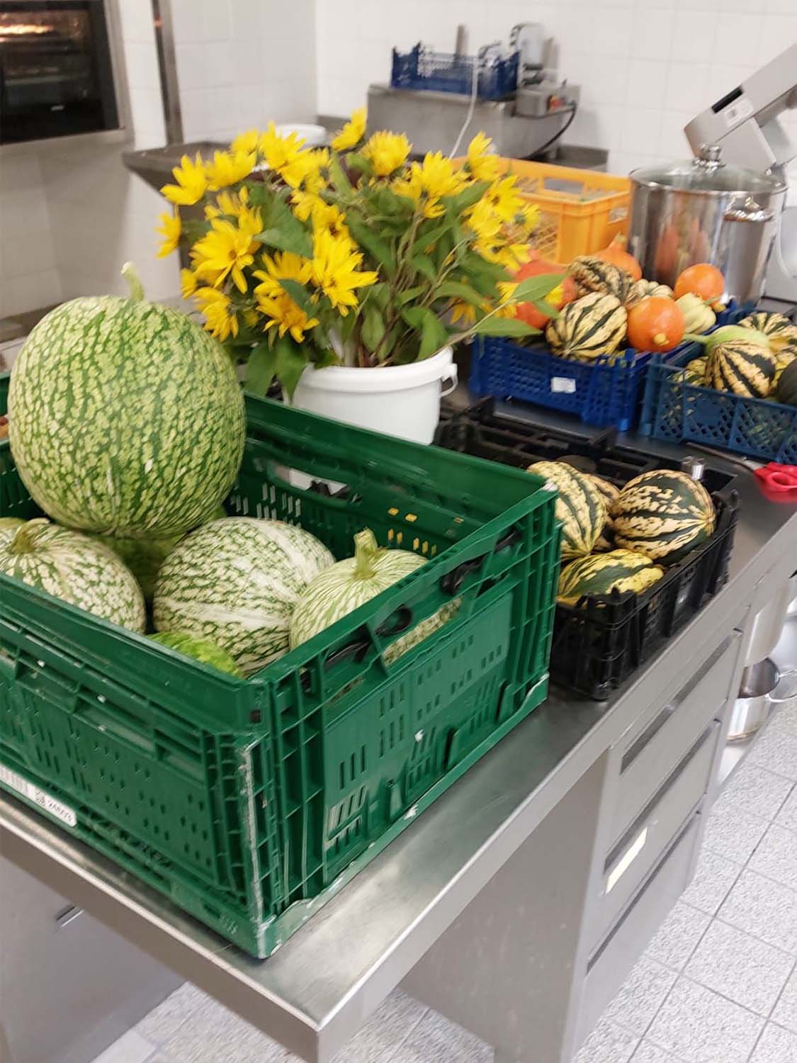 Diese pflanzlichen Rohstoffe wurden in Mensa und Cafeteria direkt zu leckeren Speisen verarbeitet – „regional und saisonal“. Von den Kürbissen haben wir für die Cafeteria 80 Portionen „gebackenen Ofenkürbis mit pikanter Tomatensoße, Fetakäse und Reis/Backkartoffeln“ zubereitet. Die vielen Äpfel wurden von der IBA-Klasse 207 direkt vom Baum geerntet, geschält, entkernt, zerkleinert, zu Apfelschnecken und Apfelmus verarbeitet und verspeist.