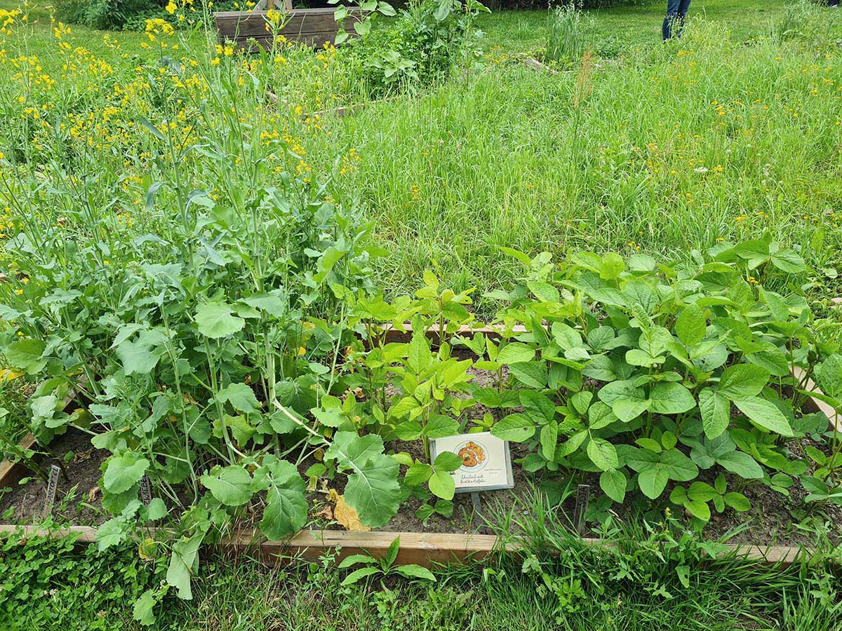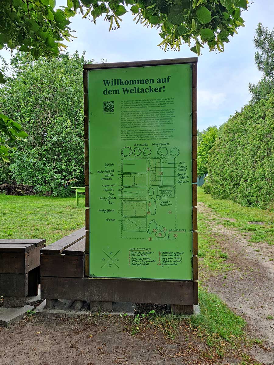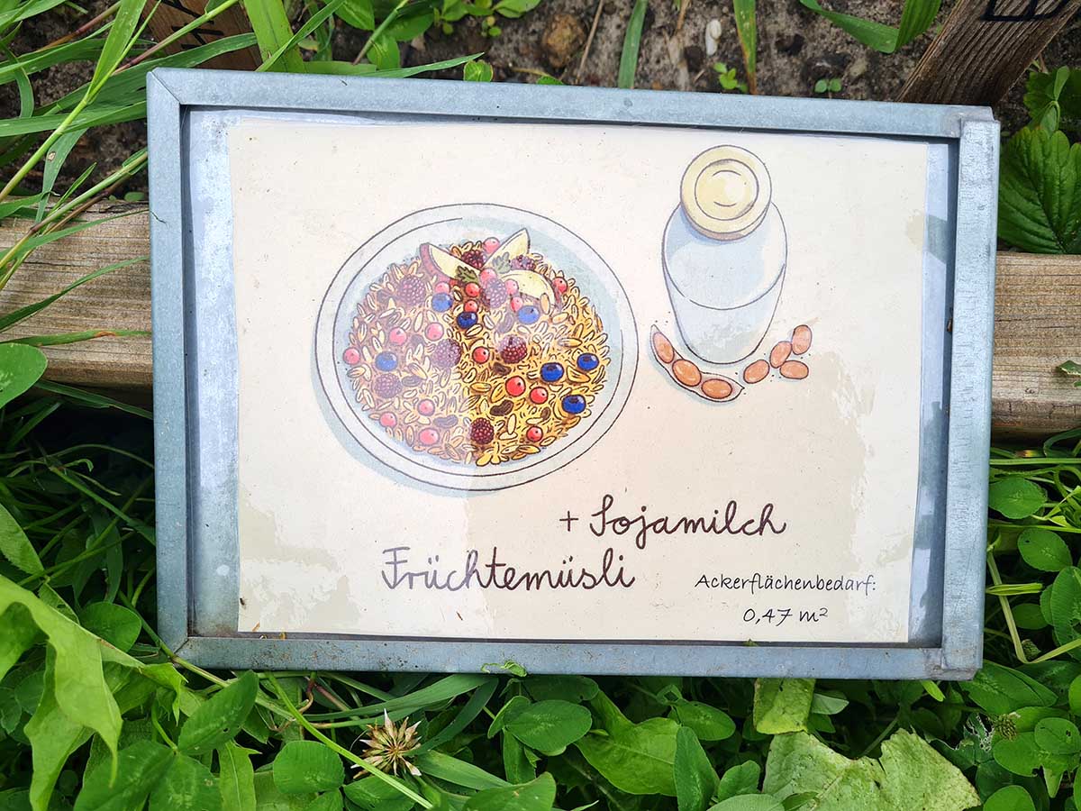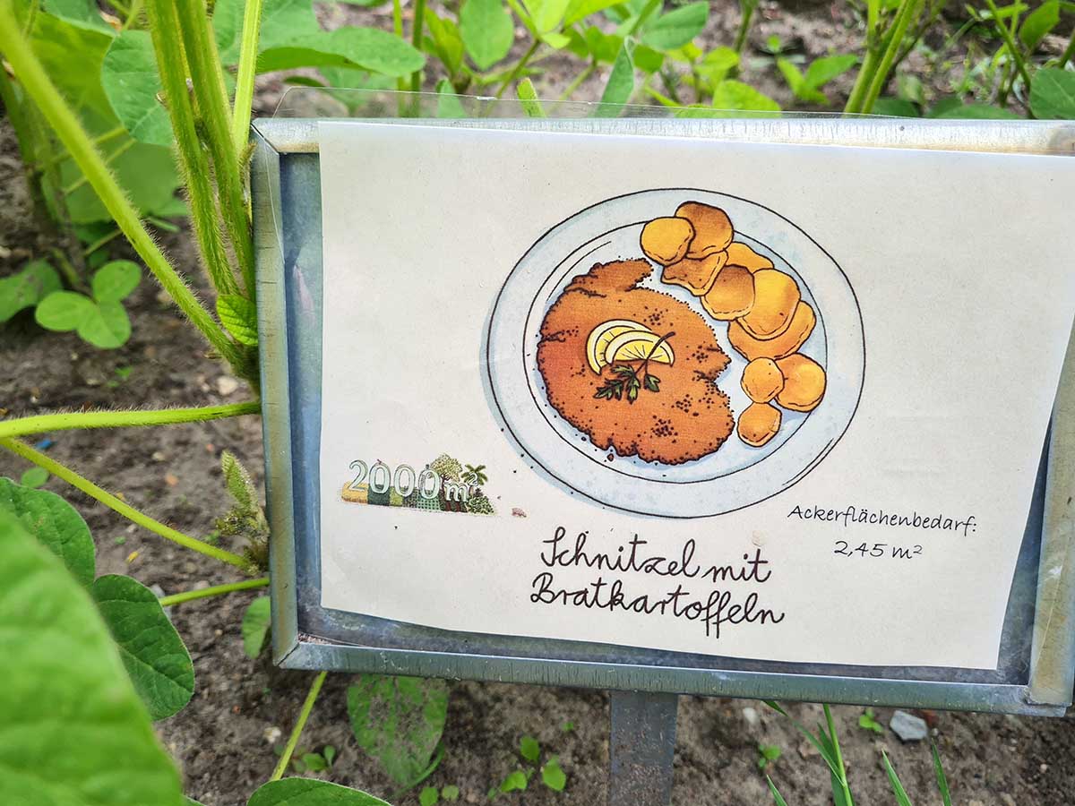 Beide Besuche starteten mit einer herzlichen Begrüßung und einem tiefen Durchatmen in dieser entspannenden Umgebung. Um von dem Projekt Weltacker einen ersten Eindruck zu bekommen, starteten wir mit dem Flächenbuffet. Hier wird visuell dargestellt, wie viel Fläche man für den Anbau der Rohstoffe für ein einzelnes Gericht benötigt. Hierbei werden unterschiedliche Aspekte berücksichtigt, z. B. wird als Frühstück ein Müsli mit Früchten visualisiert, welches mit drei verschiedenen Milchsorten konsumiert werden kann und welche Auswirkung dies auf die benötigte Ackerfläche hat. Besonders erschreckend ist die Ackerfläche für ein Schnitzel mit Bratkartoffeln.