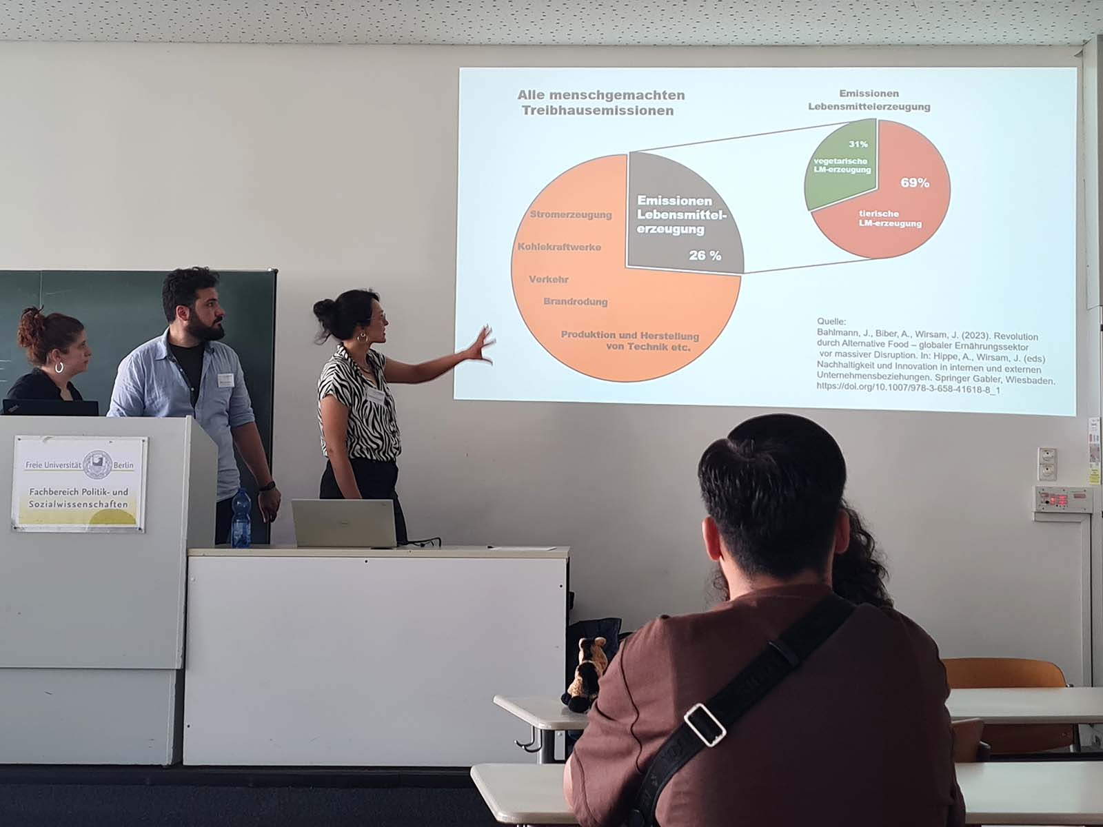 Start des Projekts war der Besuch der Freien Universität Berlin (FU), in der die Lehramtsanwärter/-innen, die das Projekt für uns geplant und durchgeführt haben, bereits auf uns warteten. Thema des Workshops war die Gestaltung einer „Nachhaltigen Mensa“ bzw. Essensverpflegung in Schulen. Um hier qualifiziert arbeiten zu können, lernten die Schüler/-innen den Begriff Nachhaltigkeit kennen und knüpften mit Beispielen an ihr Wissen an. Zum Abschluss des ersten Projekttages besuchten wir die Mensa und Großküche der FU und konnten dem Küchenchef Fragen stellen.