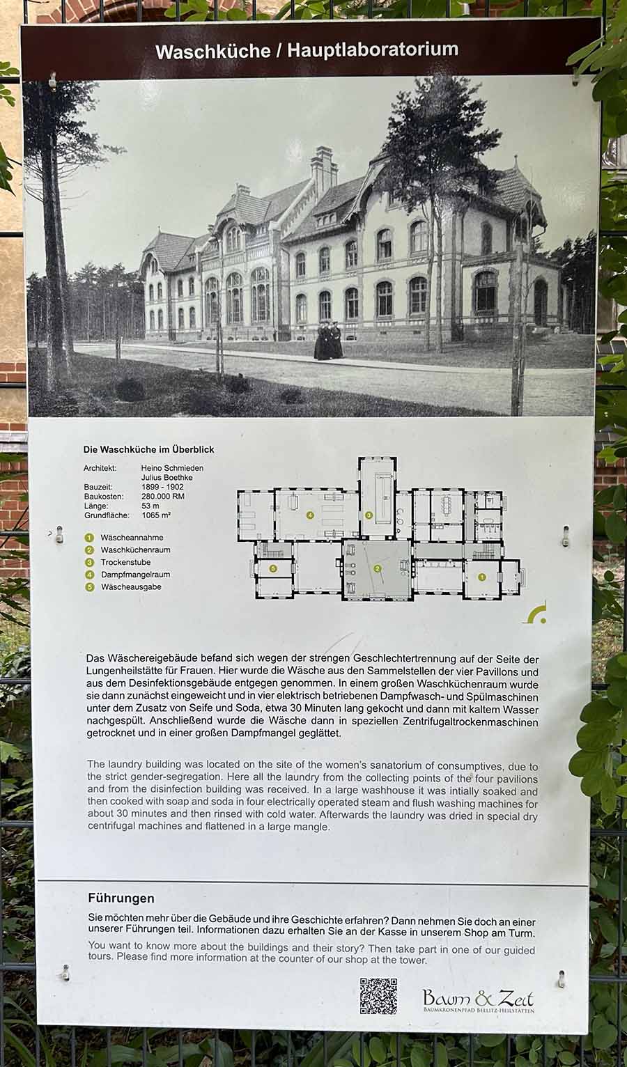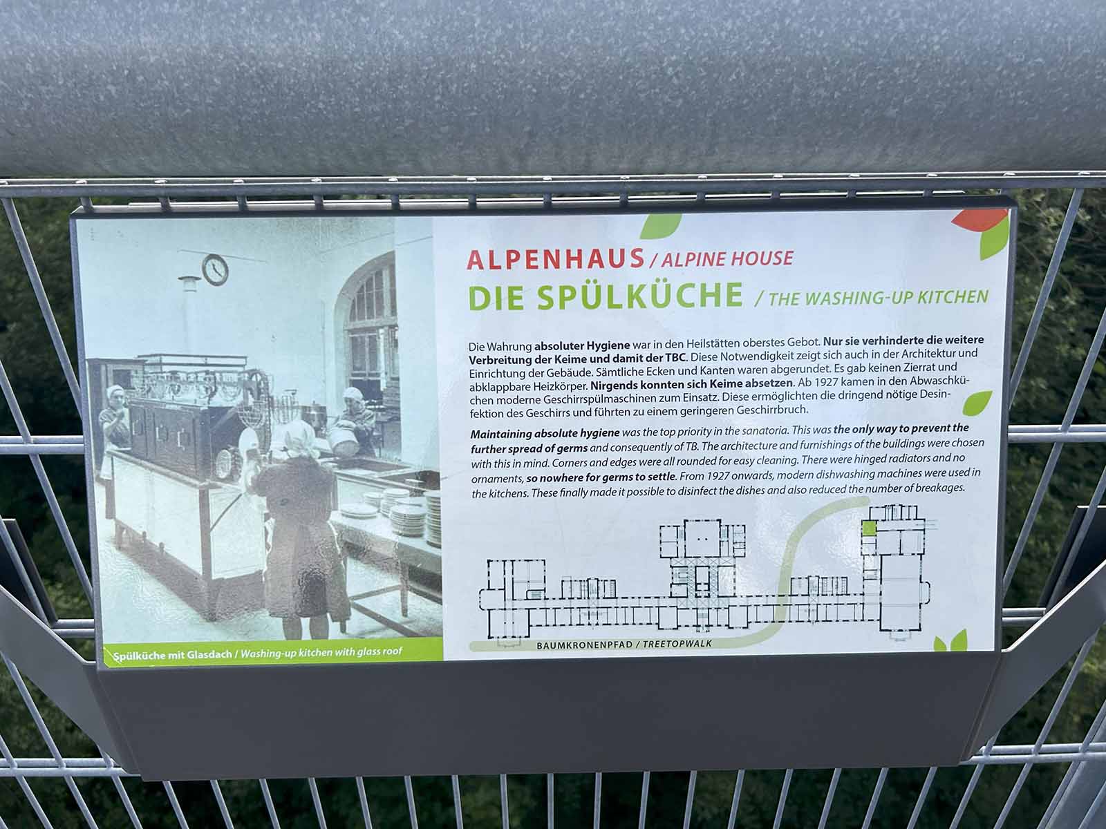 Den Abschluss bildete eine Führung durch das sogenannte "Alpenhaus". Dort erfuhren wir viel vom ehemaligen Klinikalltag, Lebensbedingungen vor gut 100 Jahren und vor allem, dass die Klinik fast vollständig autark lief - von der Wäsche und der Küche über den Gemüseanbau bis hin zur eigenen Schweinezucht. Selbst die Transport-Wagen liefen über eine Art Elektro-Antrieb, um die Atemwege der Patientinnen und Patienten zu schonen, die hauptsächlich kamen, um ihre Tuberkulose auszukurieren. Auch die Erkenntnisse zu bestimmten Hygienevorkehrungen waren selbst damals schon sehr fortschrittlich.