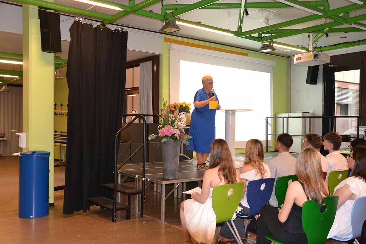 Als Abteilungsleiterin begrüßte Frau Dr. Schwalb die anwesenden Schülerinnen und Schüler, deren Eltern und die anwesenden Lehrerinnen und Lehrer herzlich. Sie erwähnte die Vielfalt der Themen, mit denen sich die Prüflinge auskennen mussten, die zahlreichen Prüfungen und nannte Beispiele, ehe sie die Abiturientinnen und Abiturienten beglückwünschte. Neben den freundlichen Worten gab es auch Präsente, Blumen, Kugelschreiber und für die Besten Bücher.