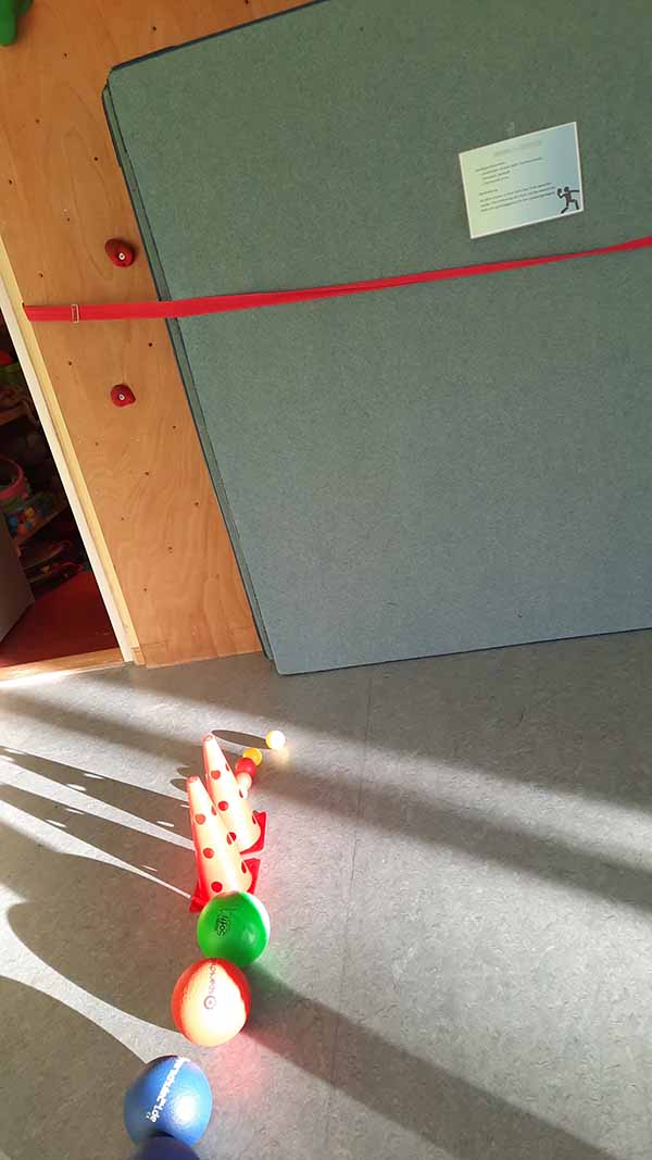 Die Kinder haben verschiedene schwere Bälle in Körbe oder Eimer geworfen. Der Schwierigkeitsgrad wurde dabei durch die Entfernung und das Gewicht der Bälle bestimmt.