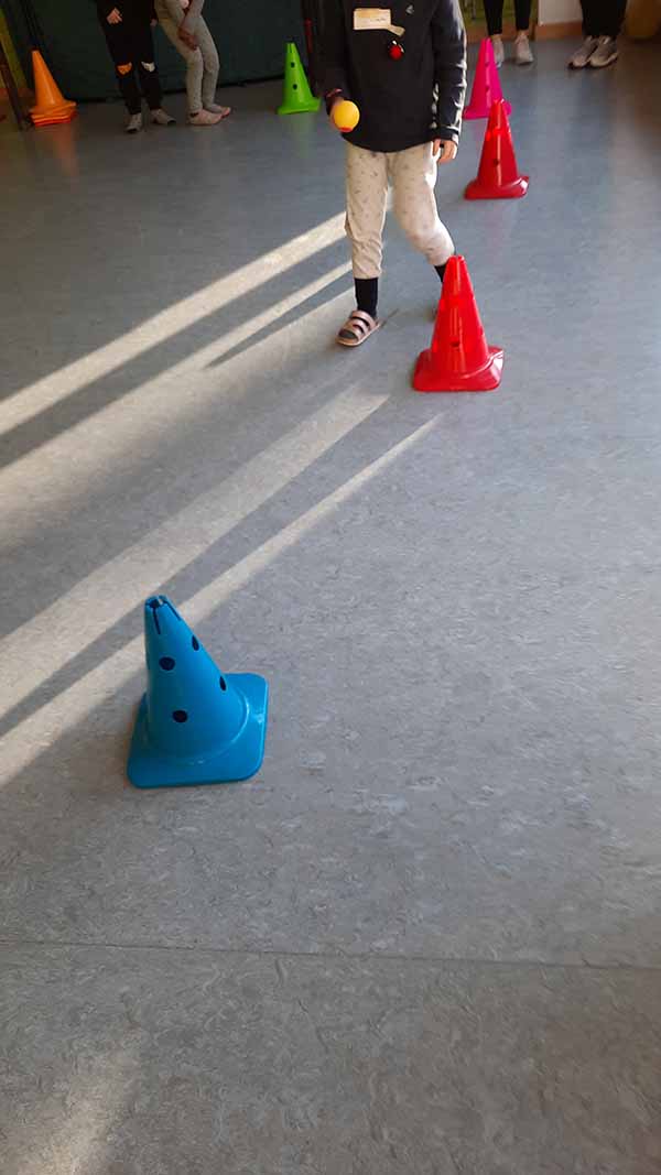Mit einem Ball auf einem Löffel haben die Kinder einen Slalomkurs gemeistert, ohne dass der Ball herunterfiel. Diese Übung stärkte ihre Balance und Konzentration.