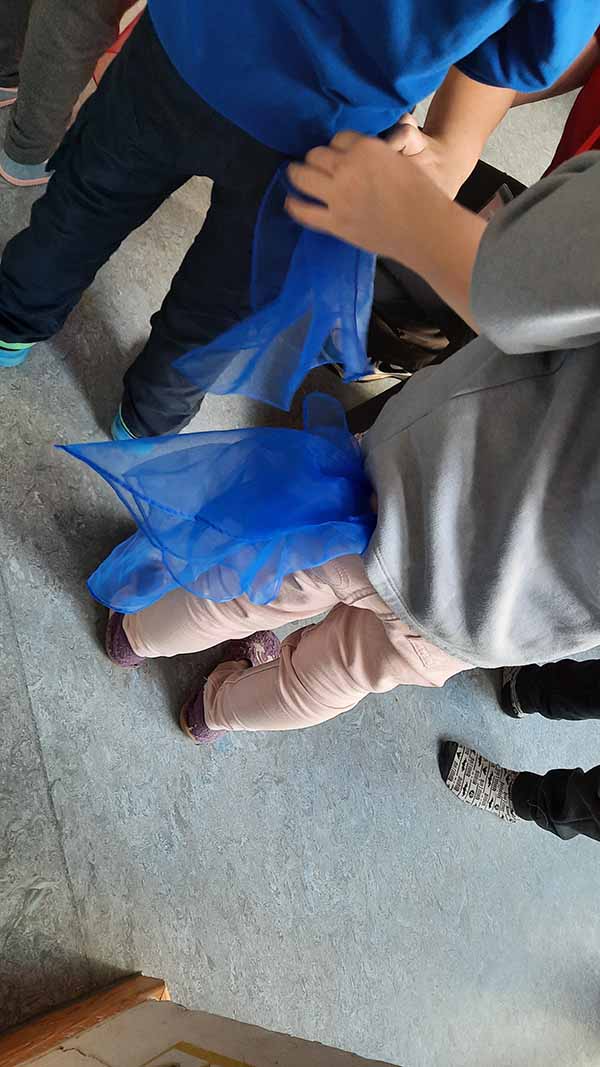 Wir wurden in vier Gruppen aufgeteilt, und jede Gruppe führte eine Station durch. Gegen 9:45 Uhr waren wir vor Ort. Zunächst zogen wir einheitliche Kleidung an, um als Team besser erkennbar zu sein. Danach holten wir die benötigten Materialien aus einem kleinen Lagerraum, der sich in der Sporthalle des Kindergartens befindet.