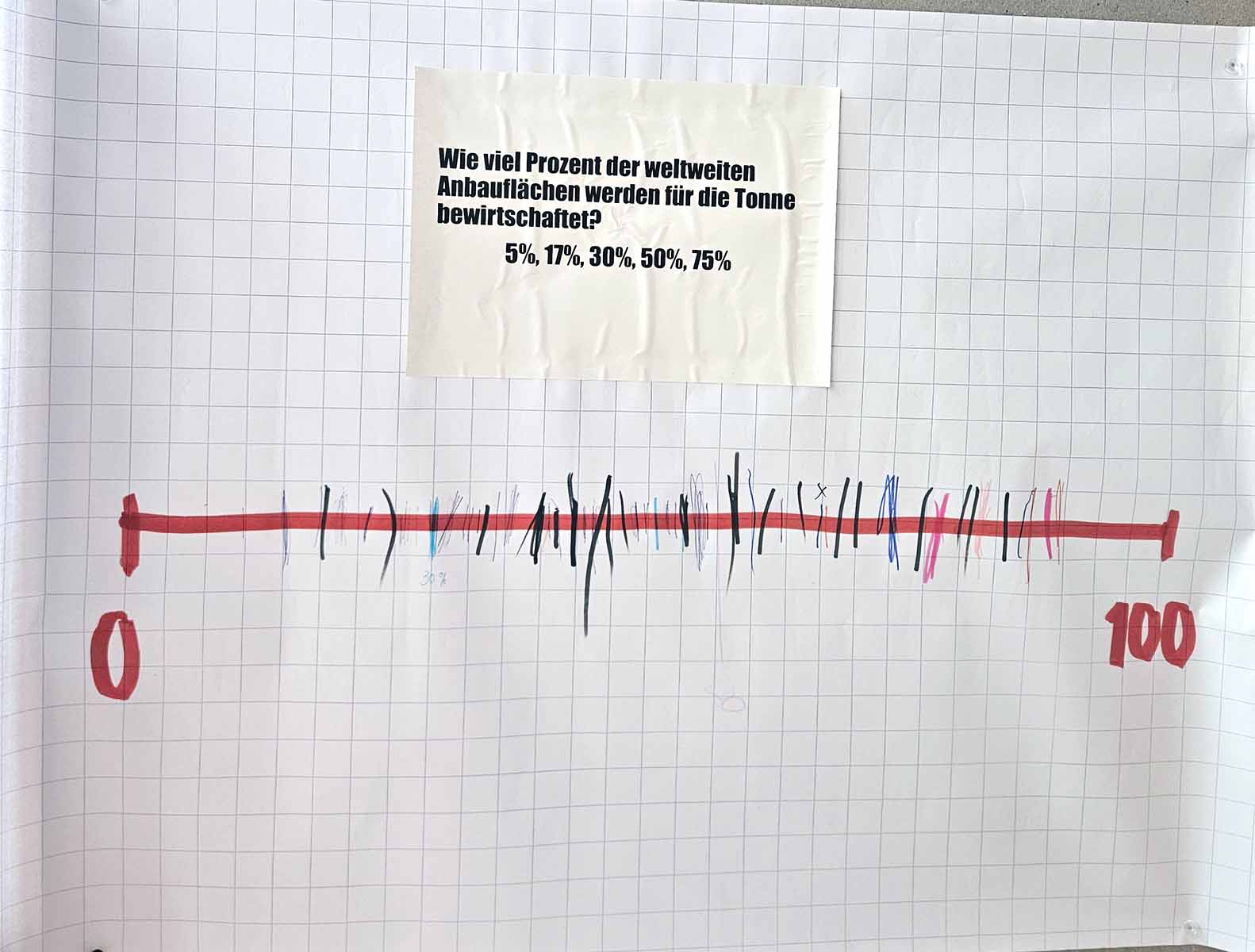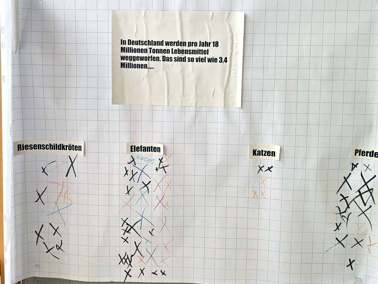 Bevor es zur Auftaktveranstaltung ging, wurden die Schüler/-innen zunächst an das Thema herangeführt, in dem sie dazu angehalten wurden, ihre Einschätzung bezüglich der in Deutschland weggeworfenen Lebensmitteln, der weltweit in der Lebensmittelindustrie arbeitenden Menschen sowie der weltweit für die Tonne bewirtschafteten Anbauflächen abzugeben.