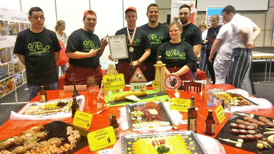 Voller Stolz können wir nun sagen, dass der Sieger des diesjährigen Leistungswettbewerbs der teilnehmenden Bundesländer aus der Hauptstadt kommt! David Arndt aus der Klasse DVF 51w (Fleischereifachverkäufer) erzielte den 1. Platz von 52 angemeldeten Teilnehmern. Seine Marzahner (Grill-)Platte überzeugte die Fachjuroren und erreichte 99 von 100 möglichen Punkten. Auch der Erfolg seiner Mitschüler konnte sich sehen lassen. Die Platten wurden einmal mit „Silber“ und dreimal mit „Bronze“ ausgezeichnet.