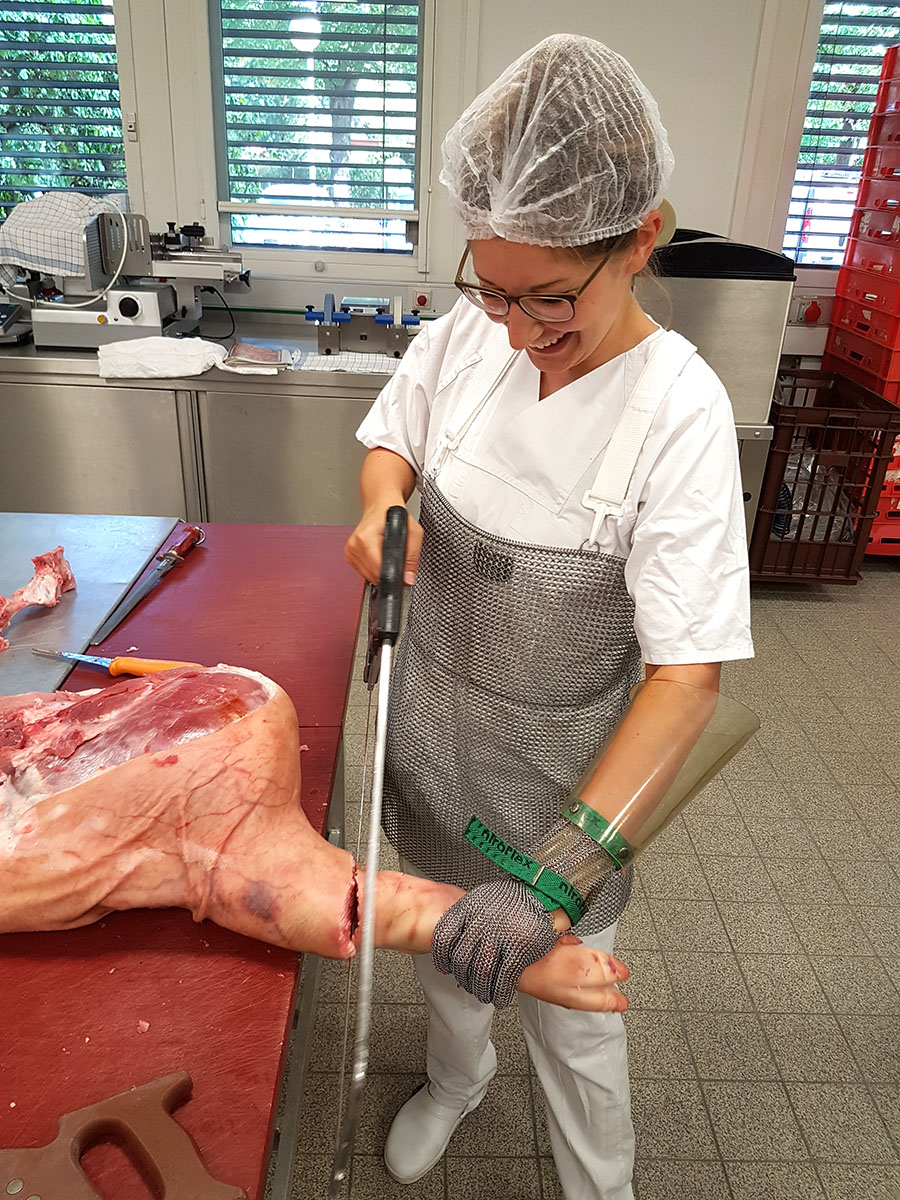 Die Ergebnisse der Zerlegung und Verarbeitung der frischen Schweinekeulen werden in den nächsten Wochen im Verkauf im Hause zu sehen sein.