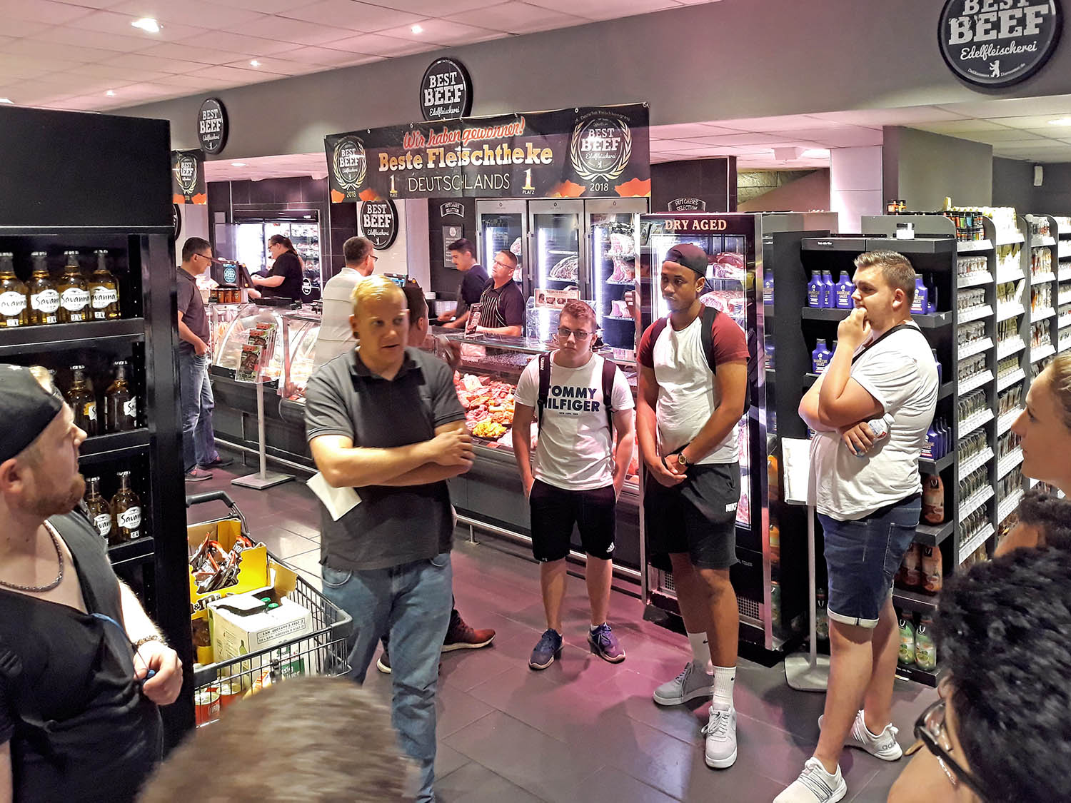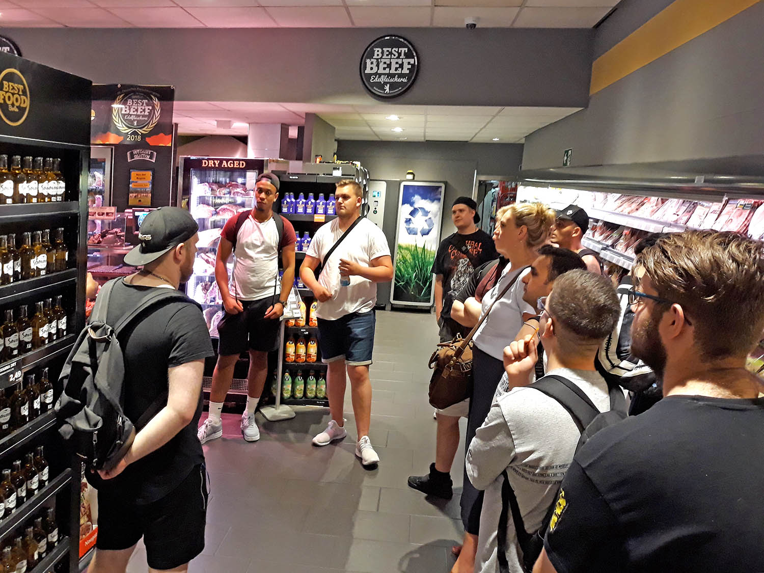 Wir besuchten alteingesessene Fleischereifachgeschäfte wie „Bünger“ und „Bachhuber“. Weiter standen auch das KaDeWe, Galeria Kaufhof und die „beste Fleischtheke Deutschlands – Best Beef“ (Nah & Gut) in der Güntzelstraße auf der Exkursionsliste. Ein Auszubildender lernt in dieser Filiale und hielt einen umfangreichen Vortrag über das vielfältige Sortiment in seiner Theke. Anschließend wurden wir von Steffen Wawrzyn, dem Fleisch-Sommelier dieser Filiale, begrüßt. Er gab uns einen Einblick in die edlen Fleisch- und Wurstspezialitäten aus der Region und aus der ganzen Welt. Auch zu Aufzuchts- und Reifemethoden und den aktuellen Trends der Fleischwelt konnte er uns Informationen geben.