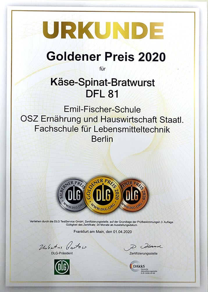 Im Frühjahr 2020 hat die Emil-Fischer-Schule erfolgreich an der Internationalen Qualitätsprüfung für Schinken & Wurst der DLG (Deutsche Landwirtschafts-Gesellschaft) teilgenommen. Unsere Schule ist jetzt vom Testzentrum Lebensmittel mit einer Gold- und einer Silbermedaille für die Qualität seiner Wurst- und Fleischerzeugnisse ausgezeichnet worden.