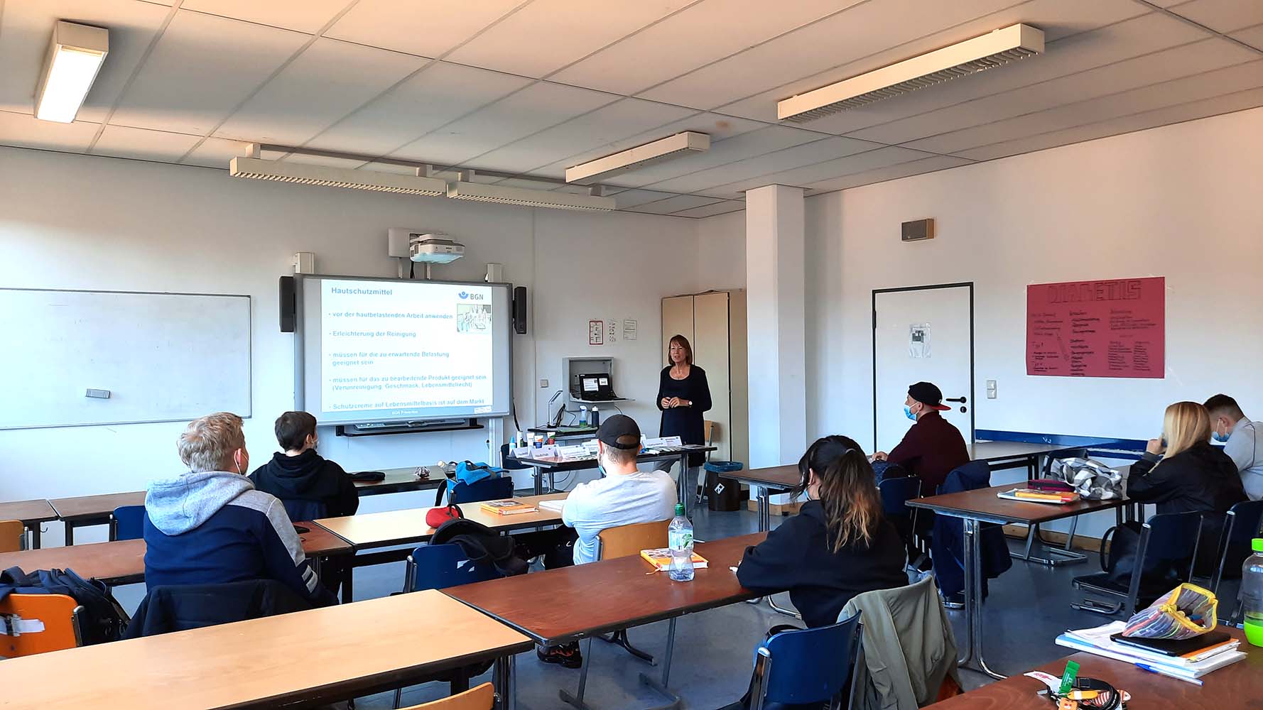 Über die Berufsgenossenschaft Nahrungsmittel und Gastgewerbe (BGN) konnten wir am 28.10. und 02.11.2021 für insgesamt fünf Klassen der Berufsschule und der Berufsfachschule (Fleischer/-innen, Fachverkäufer/-innen Fleisch und Lebensmitteltechnische Assistent/-innen) ein Seminar zum Thema Hautschutz in unserer Schule anbieten.