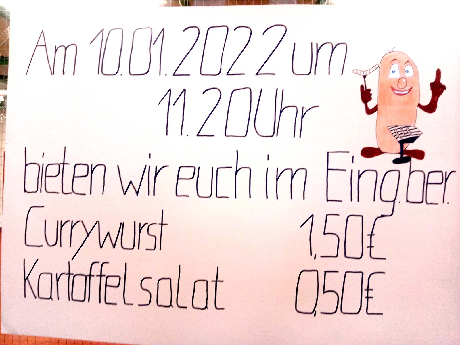 Mit großem Engagement planten und produzierten sie Berliner Currywurst mit Kartoffelsalat und verkauften diese anschließend im Foyer unserer Schule. Circa 60 Portionen fanden während der Mittagspause ihren Weg in die Mägen der hungrigen Abnehmer.