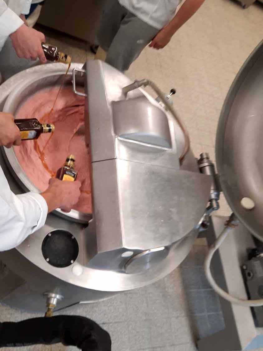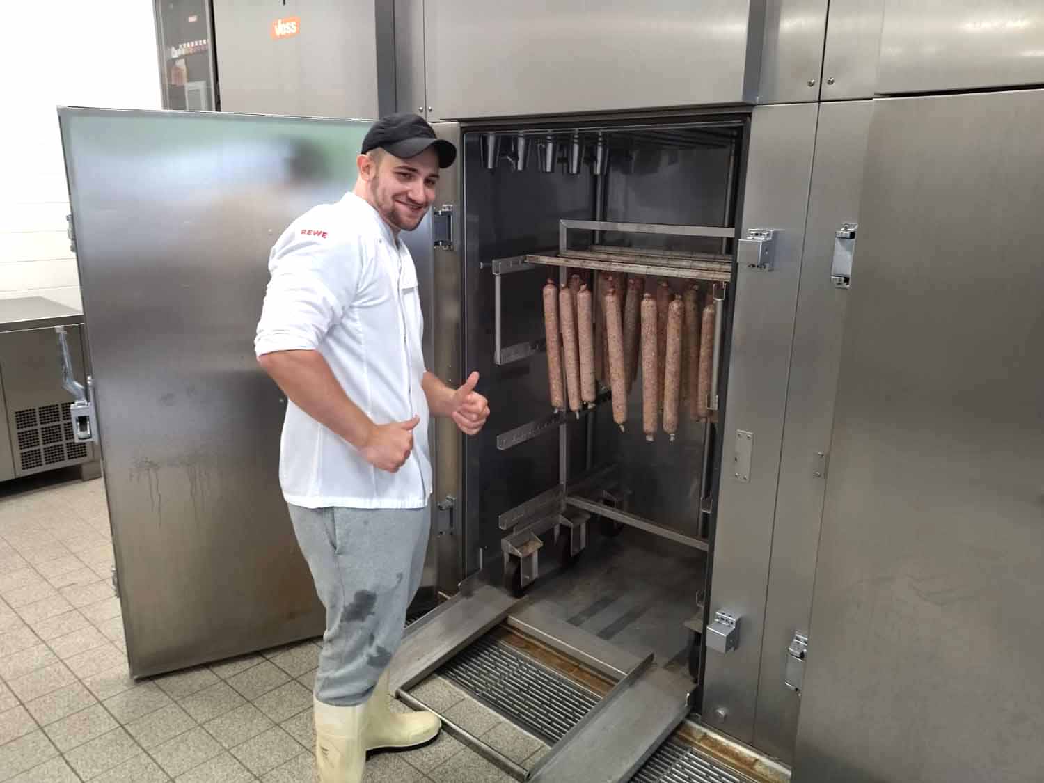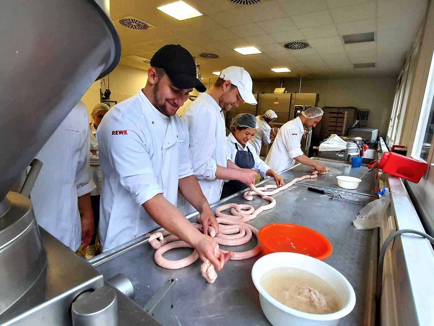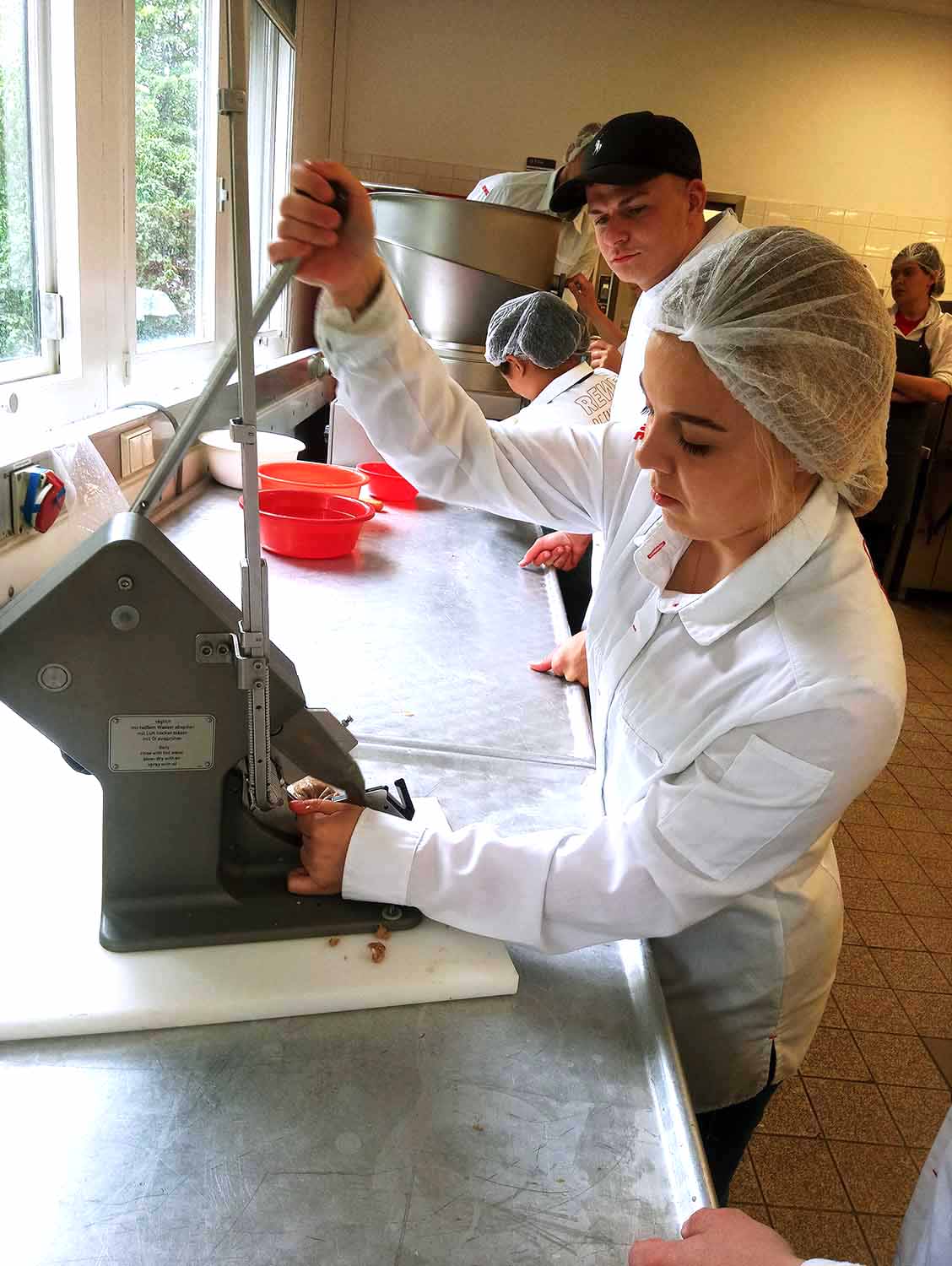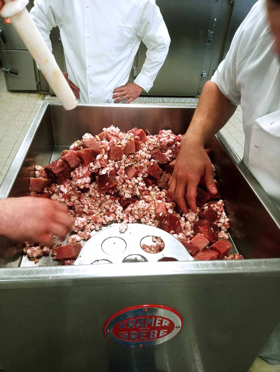 Die Rohwurst „Salami mit Fenchel“ wurde erst gewolft und anschließend in einem Menger gemengt, um sie dann zu füllen. Die zweite Wurst „Sesam-Bratwurst“ aus der Kategorie Brühwürstchen ist eine weiße Ware. Als Fetteinlage wird hochwertiges Sesamöl verwendet, welches den Geschmack so besonders macht. Hier lernten die Schüler und Schülerinnen das Kuttern nach dem „Magerbrätverfahren“ kennen.