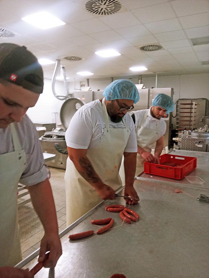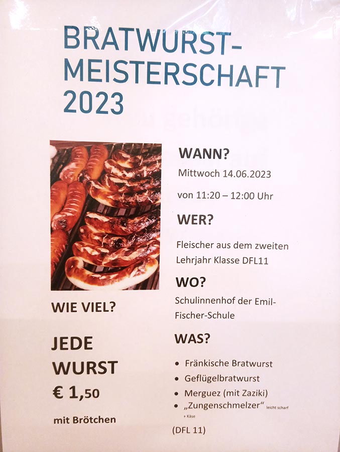 Am 14. Juni durften das Kollegium und die Schülerinnen und Schüler unserer Schule wieder traditionell darüber abstimmen, welche Bratwurstvariante ihnen am besten schmeckt. Dazu haben die Fleischer-Azubis des 2. Lehrjahres im Vorfeld vier verschiedene Bratwurstsorten mit ihren Lehrer/-nnen Frau Treite und Herrn Bachhuber in unserem Fleischtechnikum hergestellt, mit selbstgestalteten Flyern und Plakaten beworben und im Schulinnenhof gegrillt.