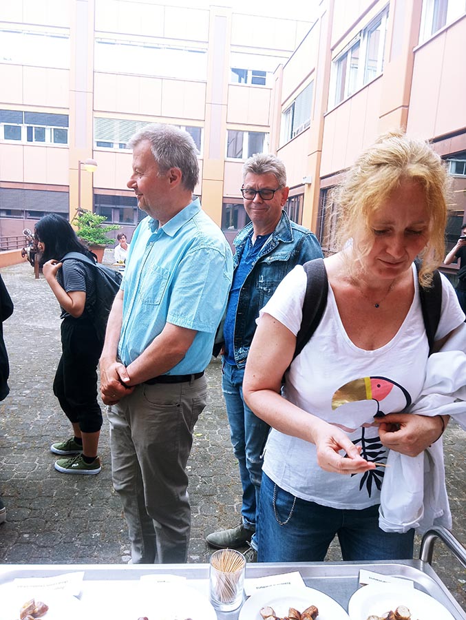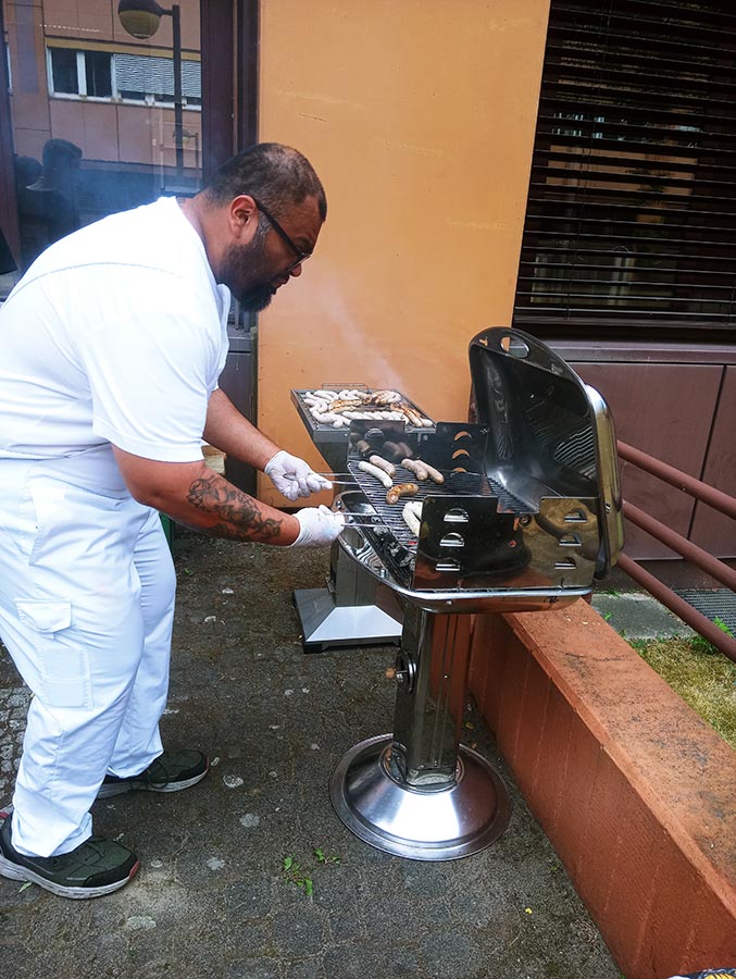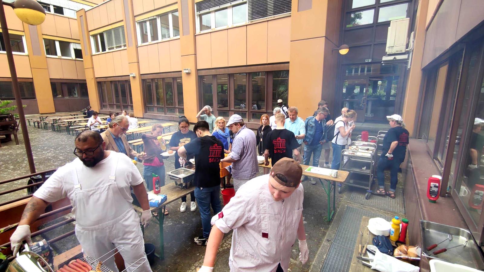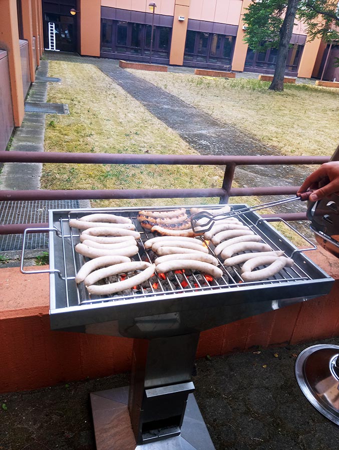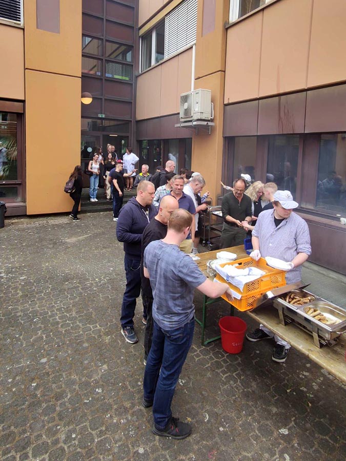 In der Mittagspause sammelten sich schnell viele hungrige Interessenten, die durch unsere fleißigen Grillmeister jedoch in relativ kurzer Zeit mit ihrer jeweiligen Lieblingsbratwurst zufriedengestellt werden konnten. Dank Herrn Gish gab es hausgemachte Brötchen aus der Bäckerei und der mit Elan und reichlich Knoblauch angerührte Tzatziki sorgte bestimmt auch in den Abendstunden noch für unwiderstehlichen Atem.