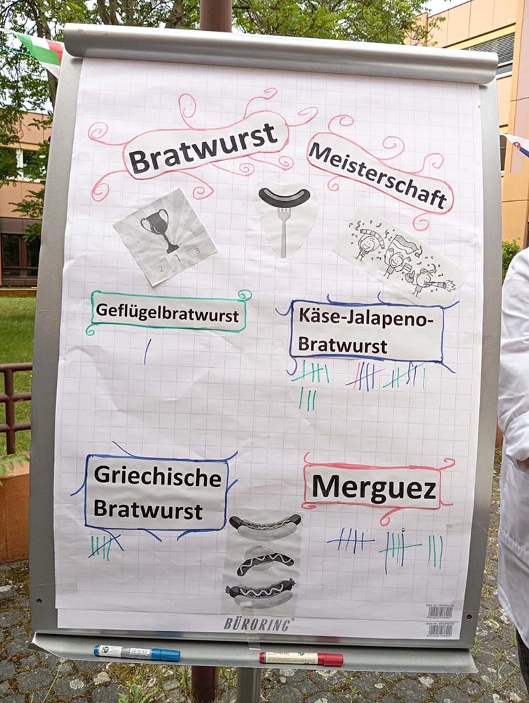 Dieses Jahr präsentierten die Fleischer und Fleischerinnen Käse-Jalapeño-Bratwurst, Geflügelbratwurst, Griechische Bratwurst und die bekannte Merguez. Die Resonanz war wieder einmal sehr groß, der diesjährige Renner war die Käse-Jalapeño-Bratwurst, gefolgt von der Merguez mit Tzatziki. Die zugehörigen Brötchen wurden von unserer hauseigenen Bäckerei zur Verfügung gestellt.