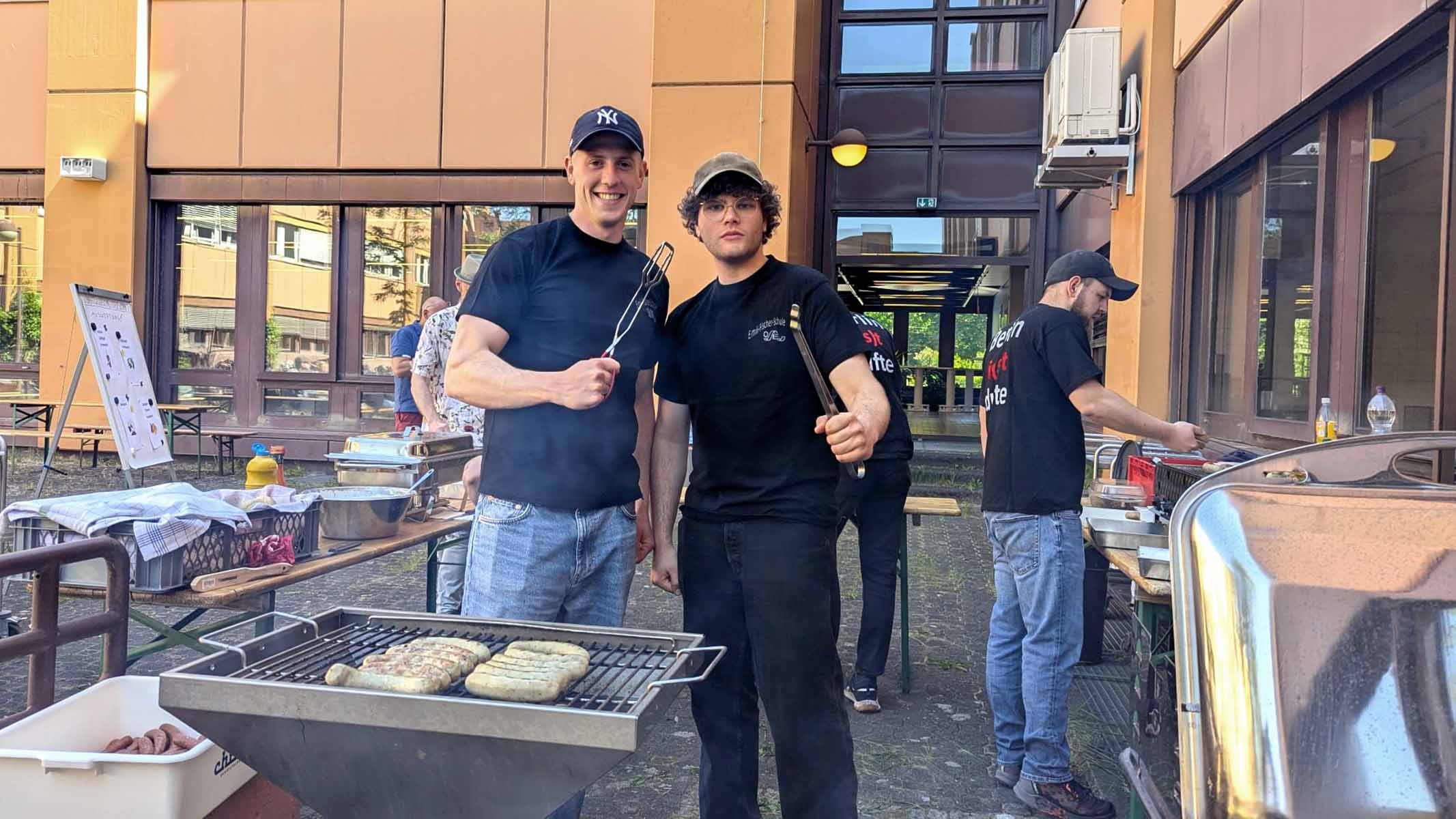 Mit viel Engagement und Teamarbeit wurde der Schulhof für das Event vorbereitet. Freddy, Jonas und Emil übernahmen den Grill, während Yannic an der Kasse für Ordnung sorgte. Nicole kümmerte sich um die freundliche Ausgabe der Bratwürste an die hungrigen Gäste.