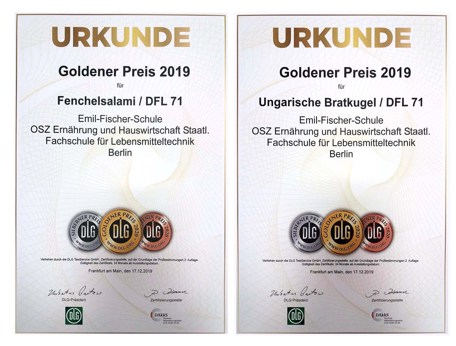 Im Frühjahr 2020 hat die Emil-Fischer-Schule erfolgreich an der Internationalen Qualitätsprüfung für Schinken & Wurst der DLG (Deutsche Landwirtschafts-Gesellschaft) teilgenommen. Unsere Schule ist jetzt vom Testzentrum Lebensmittel mit einer Gold- und einer Silbermedaille für die Qualität seiner Wurst- und Fleischerzeugnisse ausgezeichnet worden.